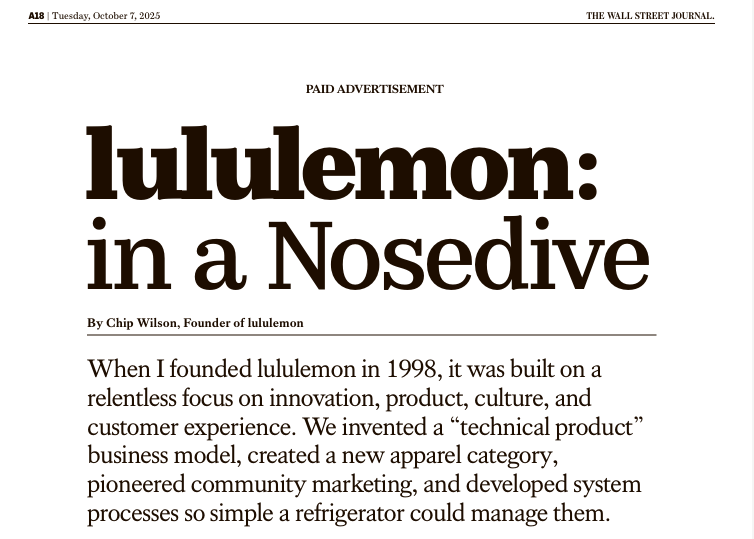 That tension is now playing out in public. Growth has slowed. Strategic bets have been misfired. As the company navigates its next chapter, founder Chip Wilson has re-emerged—not as a steward of the brand’s future, but as a reminder of why its past is no longer viable.